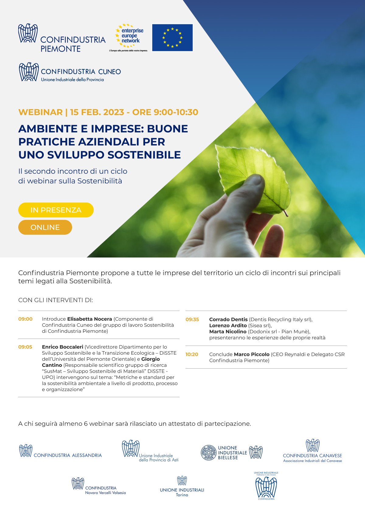 Dopo l’evento di lancio, che si è tenuto nel mese di novembre ed il primo incontro del 18 gennaio, il 15 febbraio 2023 dalle ore 9 alle ore 10.30 avrà luogo il secondo webinar gratuito dal titolo “Ambiente e imprese: buone pratiche aziendali per uno sviluppo sostenibile” che si terrà presso Confindustria Cuneo, in via Vittorio Bersezio, 9 a Cuneo.