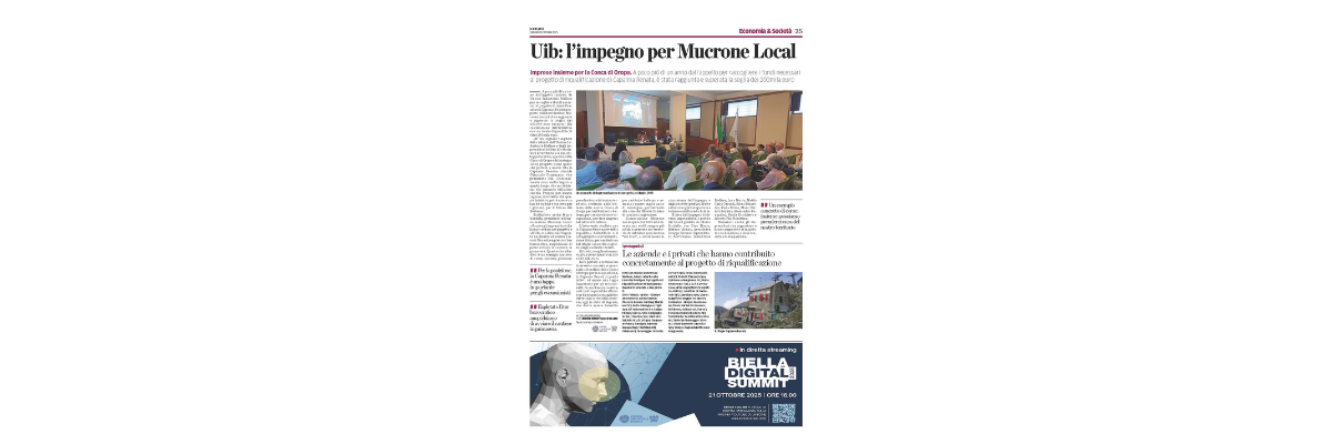 La nuova pagina dell'Unione Industriale Biellese all'interno di Economia e Società, il focus economico del venerdì su Il Biellese, è dedicata all'iniziativa dell'Uib per il territorio. A poco più di un anno dall'appello lanciato da Unione Industriale Biellese per raccogliere i fondi necessari al progetto di riqualificazione di Capanna Renata proposto dall'Associazione Mucrone Local, è stata raggiunta e superata la soglia dei 200.000 euro necessari alla realizzazione dell'iniziativa con un totale disponibile di oltre 250.000 euro.