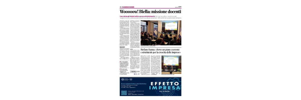 La nuova pagina dell'Unione Industriale Biellese all'interno di Economia e Società, il focus economico del venerdì su Il Biellese, è dedicata al primo incontro con 60 docenti delle scuole secondarie di primo grado biellesi realizzato in vista di Wooooow!Biella, il 14 e 15 novembre a Città Studi. Viene inoltre dato spazio al commento del presidente del Gruppo Giovani Imprenditori Uib, Stefano Sanna, al 40° Convegno dei Giovani Imprenditori di Capri.