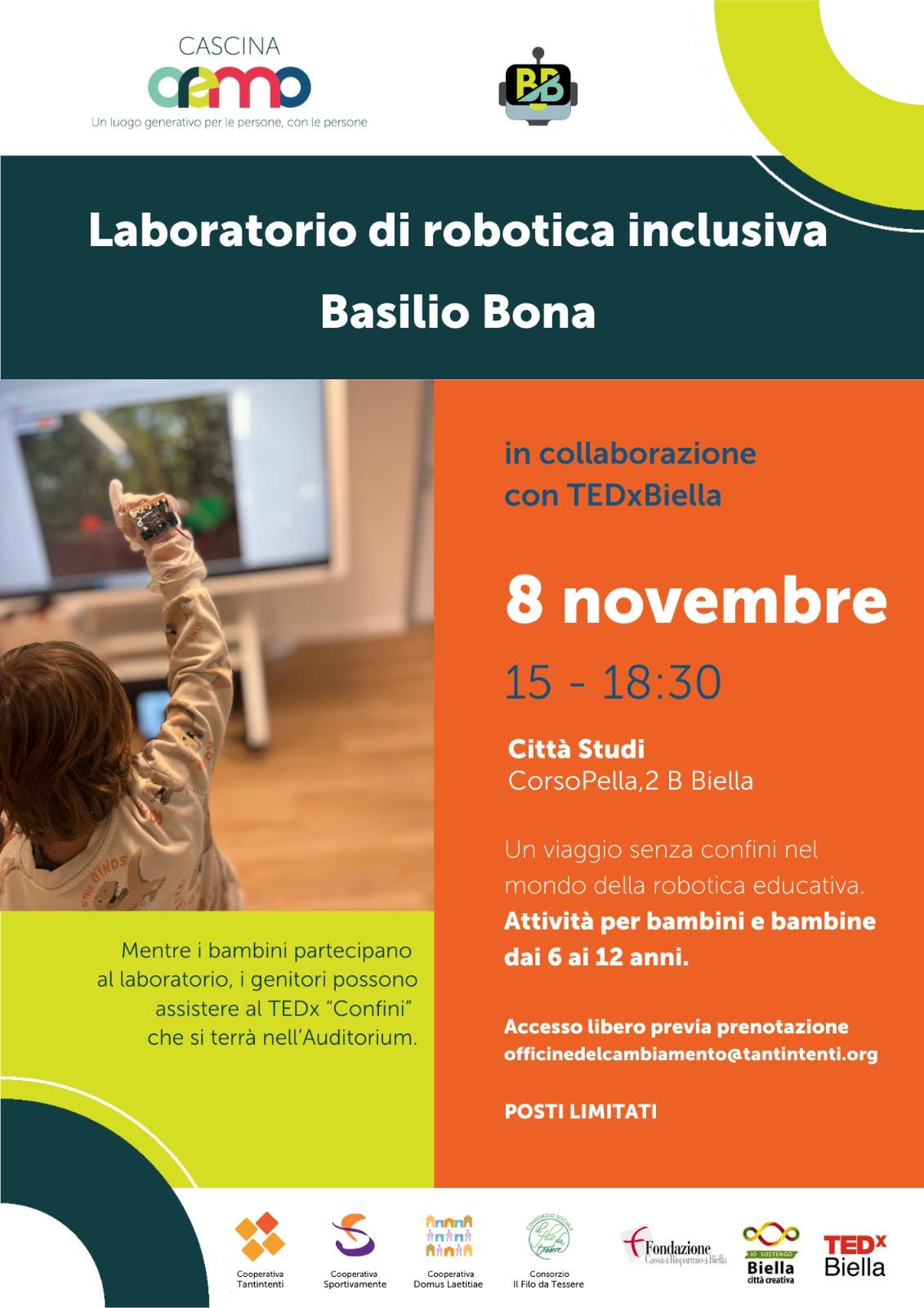 In contemporanea a TedxBiella, Cascina Oremo organizza a Città Studi il laboratorio di robotica inclusiva Basilio Bona dedicato ai bambini dai 6 agli 12 anni che potranno sperimentarsi nella robotica educativa. Accesso libero previa prenotazione (info: officinedelcambiamento@tantintenti.org).
