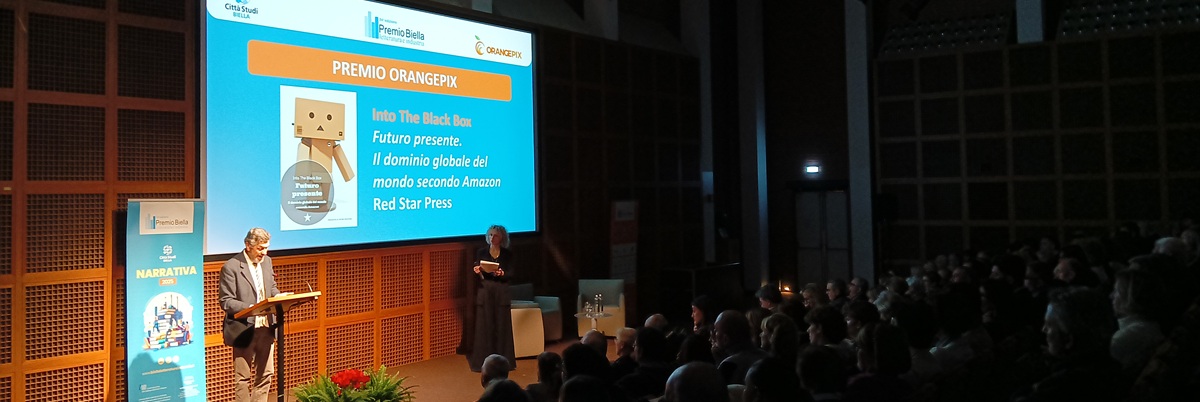 La giuria del Premio Speciale, composta da Dott.ssa Maria Eugenia Veneri, Presidente - scrittrice e saggista; Christian Ferrari, Presidente Comitato Piccola Industria con delega alla Connettività Digitale e Fisica del Territorio - Unione Industriale Biellese; Laura Ricardi, Ufficio Stampa e Comunicazione - Unione Industriale Biellese ha assegnato il Premio Speciale OrangePix 2025 al volume: “Futuro presente. Il dominio globale del mondo secondo Amazon”, Autore: Collettivo Into The Black Box - Editore: Red Star Press per aver analizzato con profondità e rigore come digitalizzazione e intelligenza artificiale stiano ridefinendo le strutture economiche e sociali contemporanee, evidenziando il ruolo degli algoritmi nel modellare comportamenti, decisioni e relazioni globali.