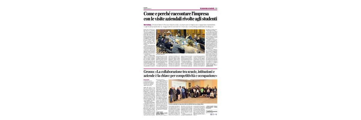 La nuova pagina dell'Unione Industriale Biellese all'interno di Economia e Società, il focus economico del venerdì su Il Biellese, è dedicata all'incontro sull'importanza strategica dello storytelling aziendale attraverso le visite, in particolare rivolte agli studenti, per le aziende che hanno aderito al Pmi Day. Inoltre si evidenzia l'intervento di Lorenzo Grosso, vice presidente Sezione Meccanici, all'evento di consegna dei diplomi di CNOS FAP.